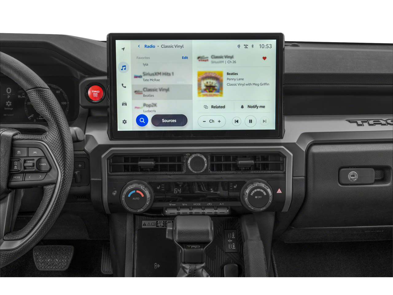 - TRD upgrade, touchscreen, wireless Apple CarPlay and Android Auto compatibility and SiriusXM w/3-month Platinum Plan trial subscription, See toyota.com/audio-multimedia for details